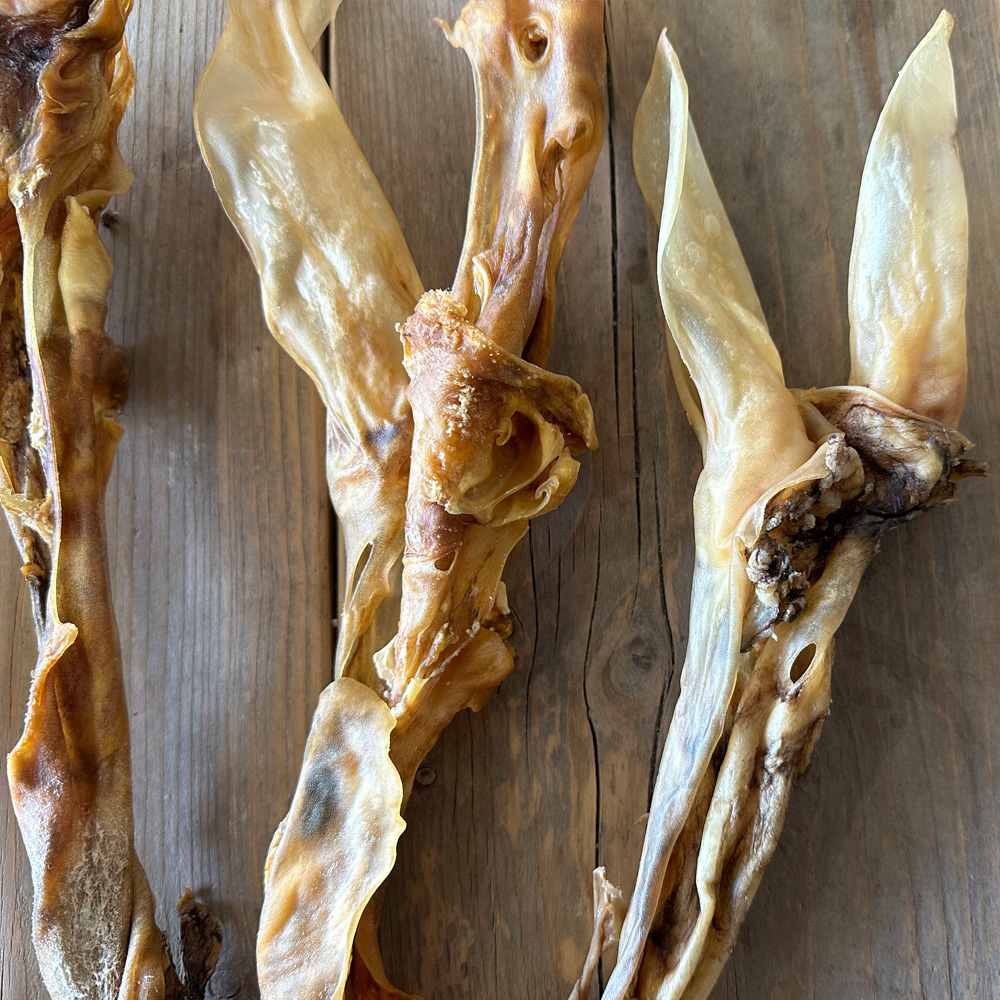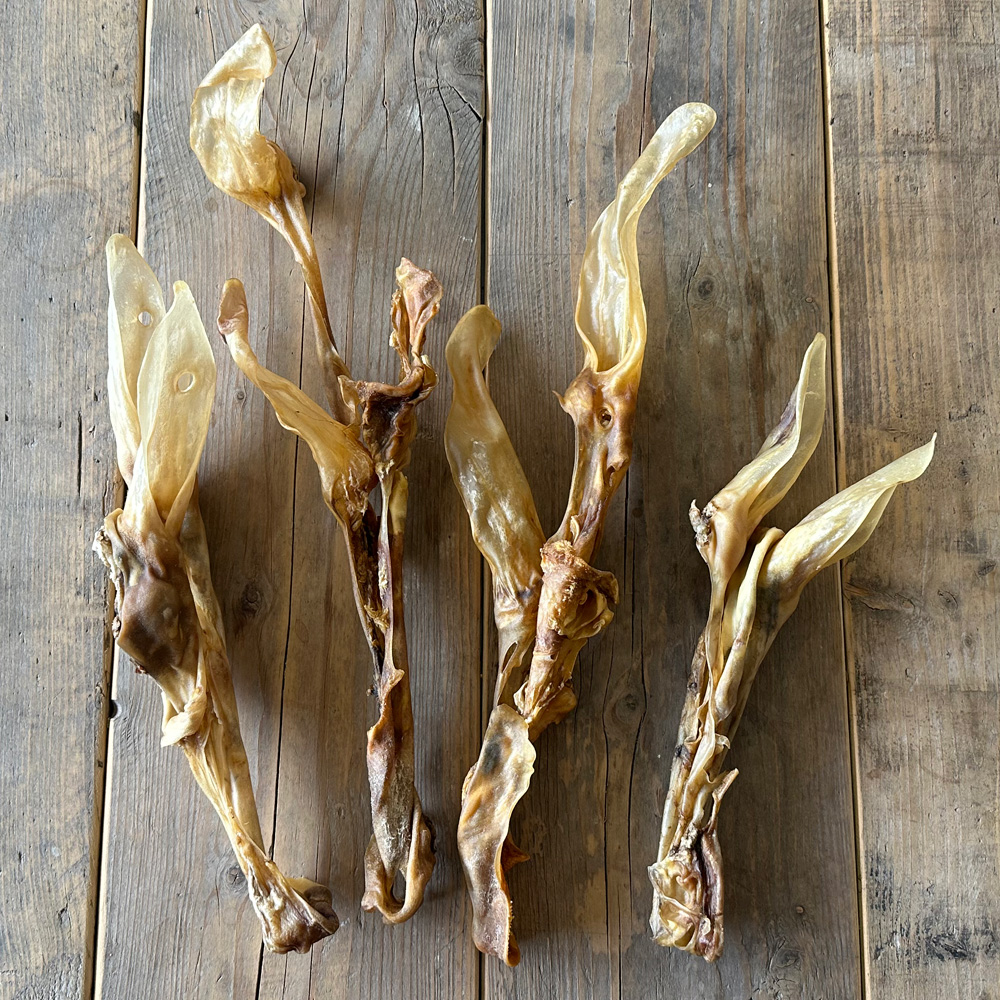 De geen losse oren kennen we inmiddels allemaal en daarom wilde we eens wat anders. Ik vroeg of we net zoals bij bijvoorbeeld runderoren deze met kophuid gesneden konden worden. Na een test een maand geleden bleek dat we een mooie grote snack kregen die niet zo heel hard is maar waar honden toch echt wel even druk mee zijn. Gedroogd op een unieke langzame manier zonder enkele toevoeging.