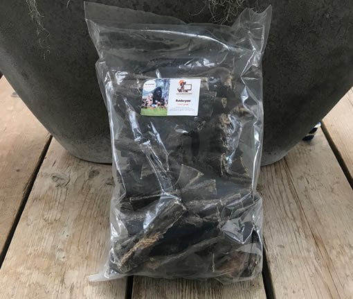 Flinke stukken runderpens waar m’n honden dol op zijn. Een snack waar ze echt van smullen. En ruikt ook niet zo heftig.