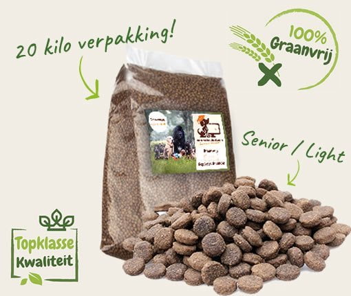 Graanvrij hondenvoer Senior / light is geschikt voor oudere honden (vanaf 8 jaar), honden met overgewicht en honden met de neiging tot overgewicht van alle rassen!