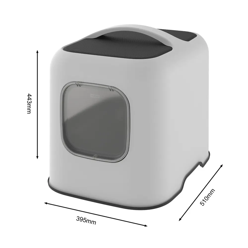 De deksel valt netjes over de onderbak met de hoge randen heen. Aan de onderzijde zitten twee inkepingen waarmee je de kattenbak in zijn geheel gemakkelijk kunt optillen.