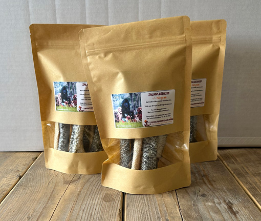 Gedroogde zalmvleeshuid een relatief onbekende snack bij veel hondenbezitters. Zalmvleeshuid is een super gezonde hondensnack welke wij vaak geven aan de honden. Probeer eens een zalmvleeshuid je hond zal je dankbaar zijn. (dit product ruikt heerlijk)